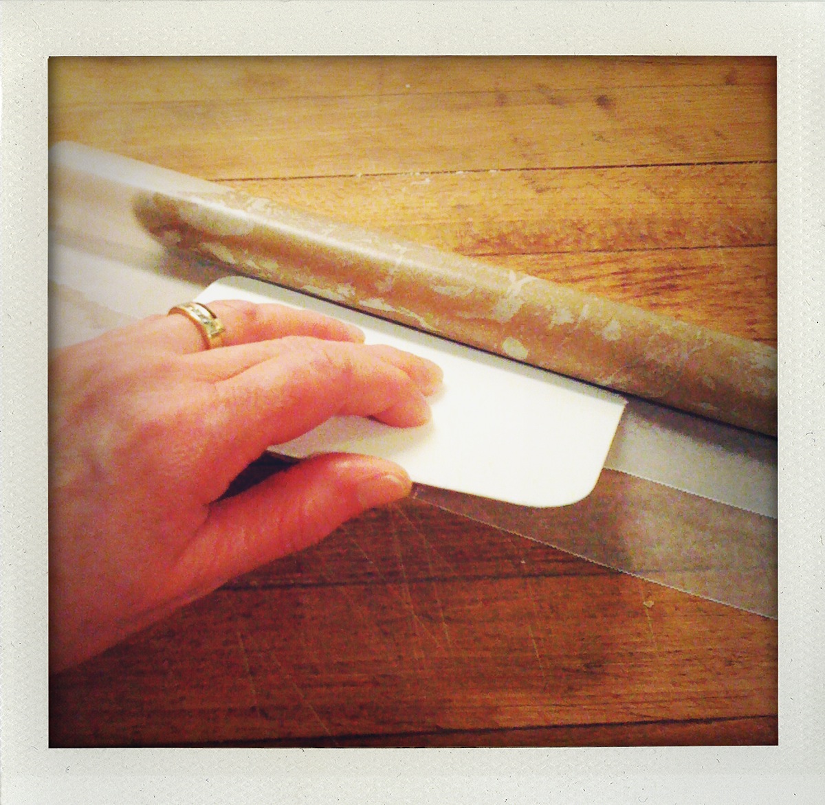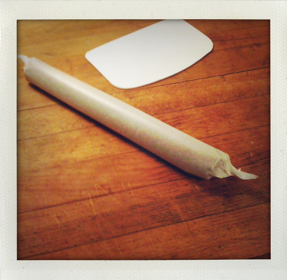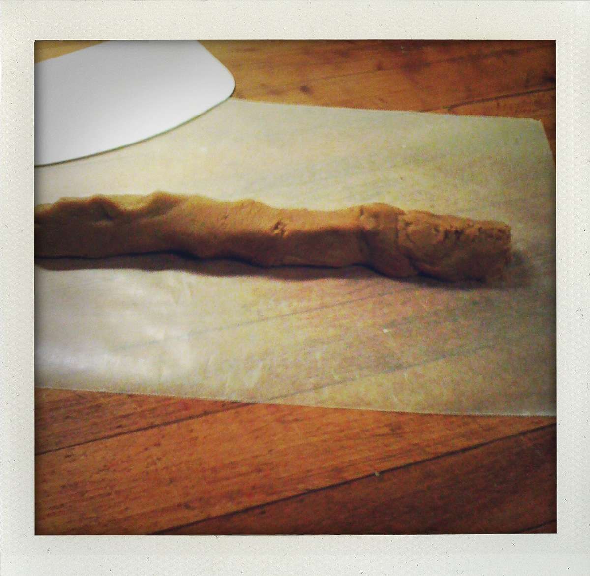 Fold one end of the wax paper over the dough log and with a dough scraper or some other form of straight edge (a ruler will work) smoosh the dough so that it is rolled into a round shape and most of the air bubbles are out. Don’t make yourself crazy though because we’re aiming for the illusion of Martha, not the reality.