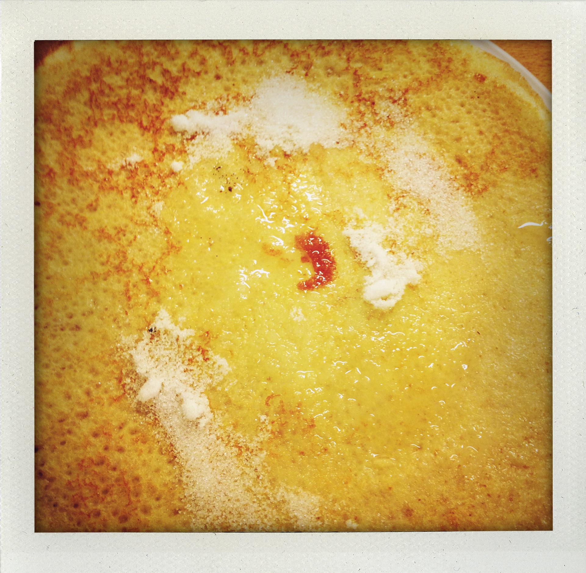 Once your crêpe is cooked it’s time to decide what to put inside. Jam is always a good choice. As is the classic French combination of sugar with a squeeze of lemon juice. A smear of Nutella and sliced bananas is divine because the warm crêpe melts the Nutella slightly into a chocolate-hazelnut ooze. Likewise honey spreads itself when drizzled over a warm crêpe. Fresh fruit thinly sliced is good. I’ll occasionally saute some apples with a little cinnamon sugar. The choices are only limited by what’s in your kitchen. Once you’ve chosen a filling it’s simply a matter of rolling up your crêpe and eating.