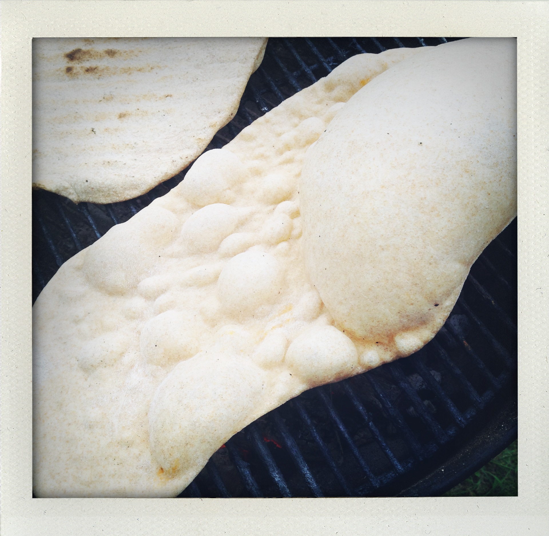 To make pizzas punch dough down and grab a fist size piece. Roll out thinly. Grill on one side. You will know it’s cooked when you see crazy bubbles all over the top. We call it moon bread, though if it looked like the surface of the moon there would be craters not bubbles. Then you can do one of two things. If there are just a few of you and you can arrange to have all the toppings next to the grill you can flip the half-cooked dough to the non-coal side of the grill and add your toppings right there. Cover until the cheese has melted and the other side of the dough has cooked. If you have a bigger crowd you may want to cook the dough on both sides then place it on a cookie sheet* and give it to people to top as they wish. When the toppings are complete slide it back onto the grill (non-coal side), cover and cook until cheese has melted.