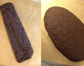 Put two long pieces of plastic wrap on your counter and spread dough into each, forming a long “log”. When the logs are roughly equal grab the short sides of the plastic wrap and bring it together so the log can no longer spread. Each log will then be about 15″ x 3″. Place on a jelly roll pan and pop into the freezer. Repeat with the nut batch. Freeze the logs for 4+ hours. I usually do at least overnight.