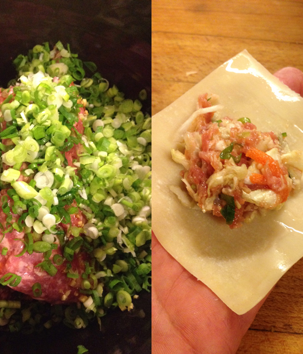 In a large bowl combine the pork or drained and crumbled tofu with the scallions, tamari, sesame oil, and ginger. Mix well and let sit for a few minutes so the flavors of the different ingredients to absorb and blend with one another. Then mix in the cabbage and carrots if you are using them. Nappa cabbage is sometimes also labeled as Chinese cabbage. If you can’t find it you can use savoy cabbage but add 1-2 tablespoons of water since savoy is a bit drier than Nappa.