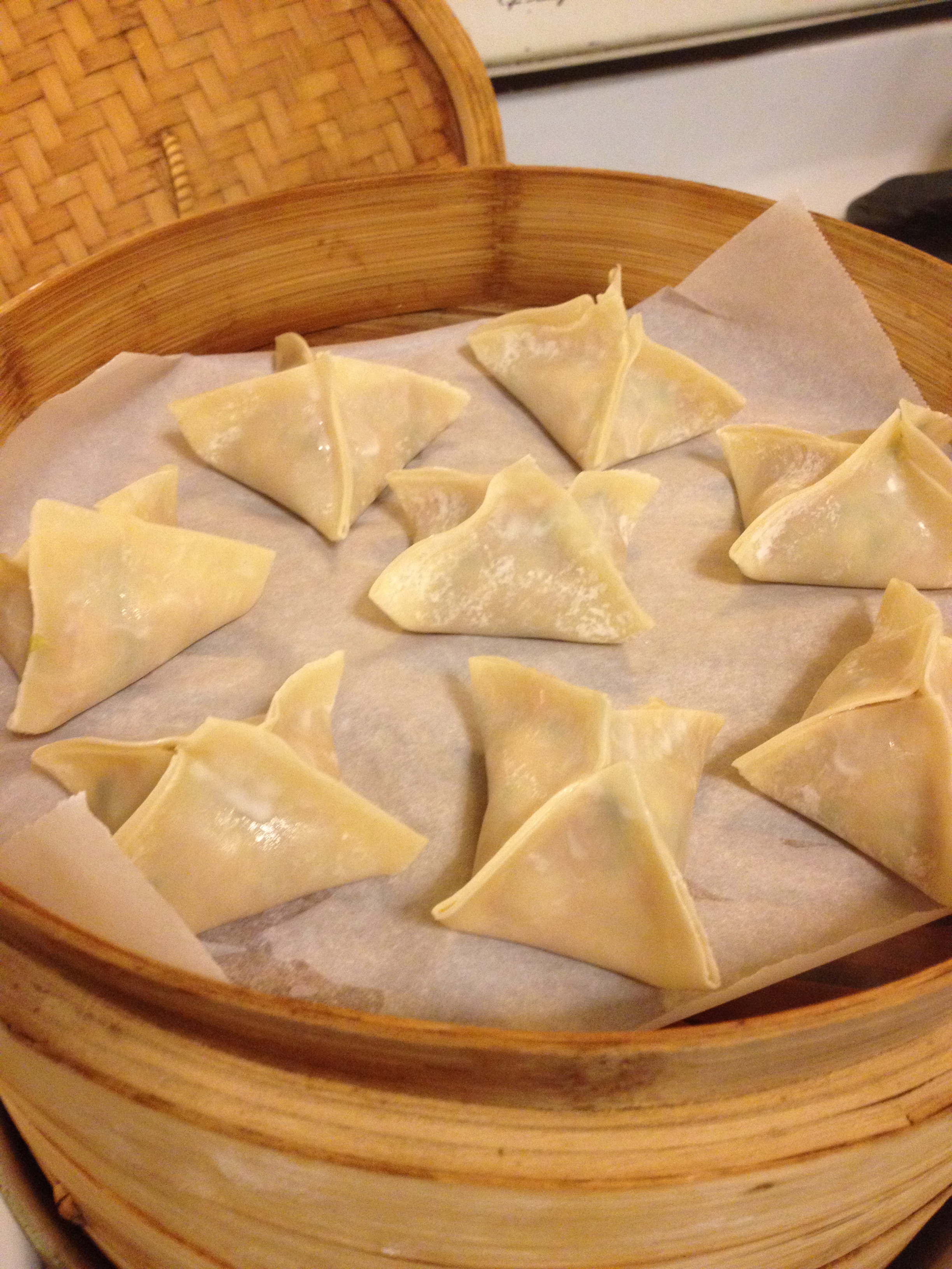 In the original recipe Susanna Foo called for round dumpling wrappers. I cannot find them at my local store so I make my dumplings with the square wrappers. To form the dumplings have on hand a small dish of water. Scoop a tablespoon of filling into the center of the dumpling wrapper and then moisten the edges by dipping your finger in water and running it along the edges. Then fold the wrapper so two sides match up. You can try to pleat the edges together, though lately I have been lazy and just sealed them shut flat, with no fancy pleats. I make the tofu dumplings into triangles and the pork dumplings into square, four-seamed packages so everyone knows which is which when they come out of the steamer. Steam for 11-13 minutes over gently boiling water. Serve while hot with dipping sauce. Don’t forget to occasionally add more water to the pan, as the water boils dry when making lots of dumplings. You can also freeze formed but uncooked dumplings. They will simply take longer to cook from their frozen state.