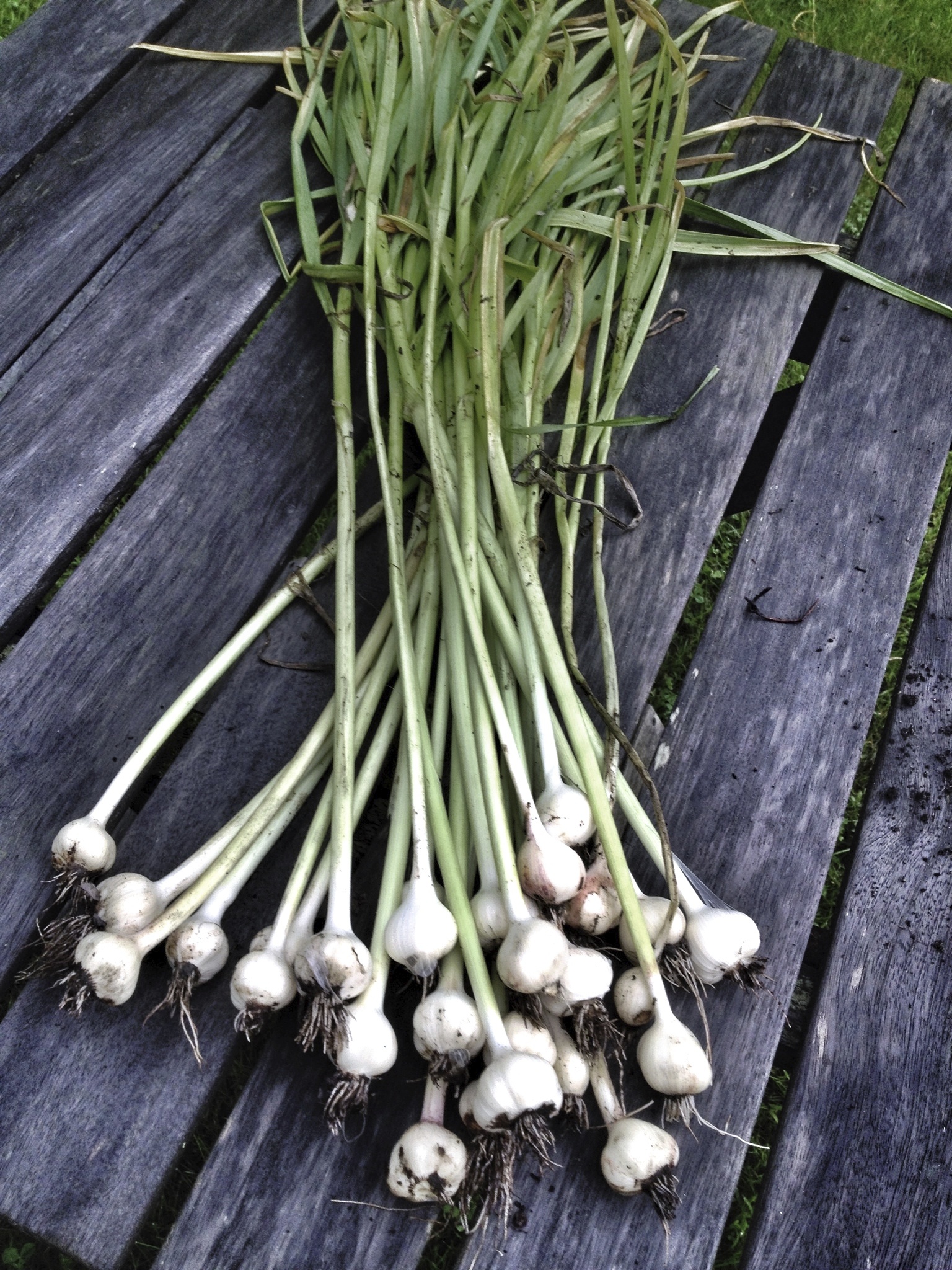 Not all of my garlic was twisted. Heck, I didn’t even plant everything I harvested. There was a surprise crop (above) which volunteered itself from an old garden in our yard. We must have garlic elves in our yard looking out for our extreme garlicy needs.