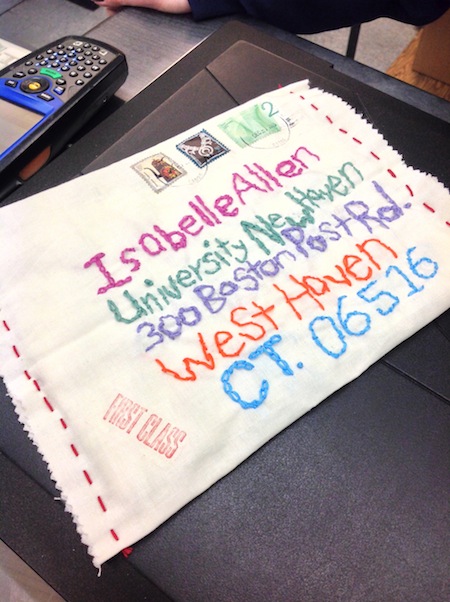 My pièce de résistance of happy mail came about shortly after Thanksgiving break. We got a robo call from the university telling us an unidentified male had been spotted on campus with guns. This is absolutely the last call any parent wants to receive. Thankfully a Good Samaritan spotted the young man with his weapons and called it in to 911. One person, who was in the right place at the right time, did the right thing and notified the authorities. The police were able to quickly apprehend the suspect, and a building-by-building search found no accomplices. How to express your overwhelming gratitude for what could have been a horrid situation? I baked some more and then spent a few days embroidering a letter to Isabelle. My inspiration was this piece of pigeon mail.
