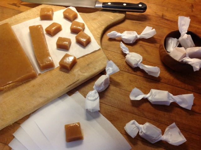 After the caramels have cooled cut them into squares or rectangles and wrap them in pieces of parchment (which is guaranteed not to stick). If you’re going to mail them wrap up a package of sea salt and put everything in a plastic bag with a napkin or two, since they are buttery. Don’t forget to mention what the salt is for. Otherwise wrap up the caramels and when you go to serve them set out a little bowl of sea salt for those who are so inclined.