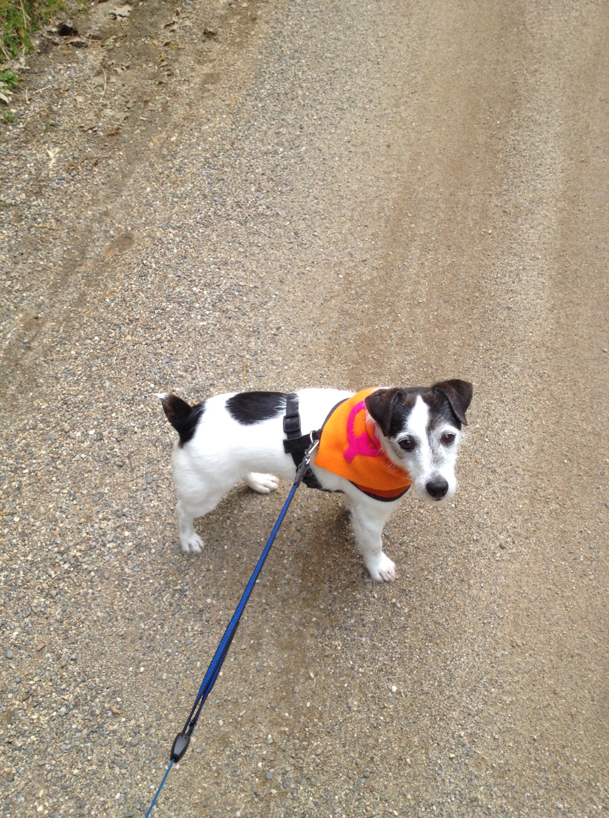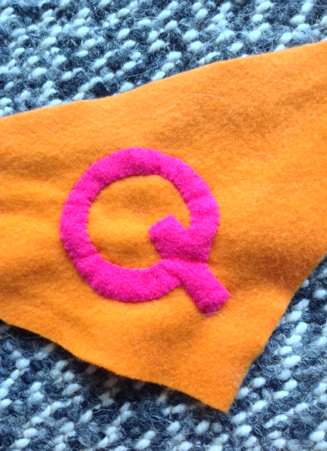 So I made Oliver a cape of shame. His very own necktie with a hot pink Q on it for quarantine. Think The Scarlet Letter meets Wishbone. My god-daughter suggested the orange and pink color combination after a favorite pair of sandals she had last summer. I hope Oliver likes wearing it for the next few weeks.