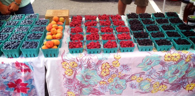 I got to the Amherst Farmer’s Market early on Saturday, before everyone had finished setting up their booths, which gave me time to meander the rows of choices as I nibbled a turkish beef roll. I picked up bags of yellow, green and fava beans for a 7 bean salad (which lasts all of 7 minutes at my house with my teenage locusts family). The bags of baby kale could not be resisted, especially after hearing about the upcoming world-wide kale shortage. I added a chunk of local goat feta and some baskets of organic raspberries so that once I was home I could throw together a lunchtime salad with a few toasted pecans and some balsamic vinaigrette.