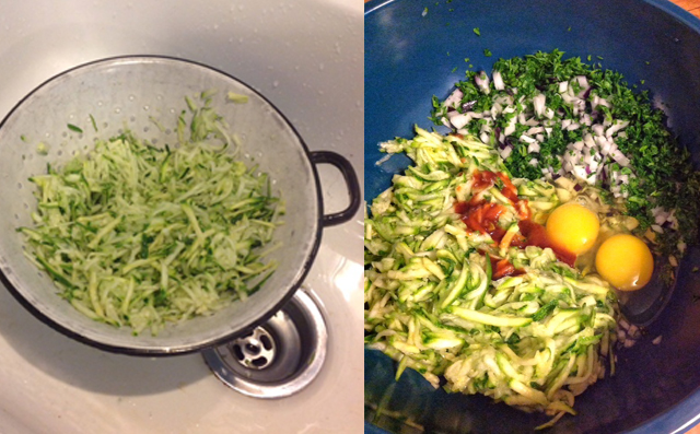 Shred the zucchini and gently toss with salt then place in a colander so they weep and lose some of their excess liquid. After 15-30 minutes squeeze dry with your hands (if you want to go nuts use a towel, but it really isn’t necessary). Toss the zucchini shreds into a bowl and add onion, parsley, eggs, tabasco sauce and  pepper. Stir together then add some flour, but go light at first.
