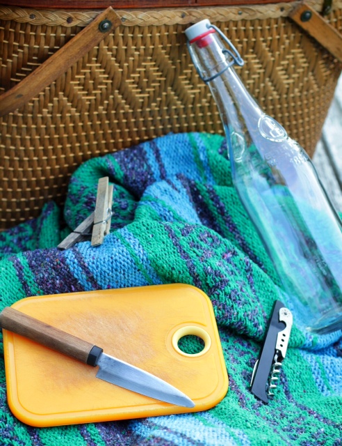 Most of my picnic baskets are either hand-me-downs or from estate sales. In a pinch I have been known to throw together a picnic into a market basket or beach bag. Cold stuff usually ends up in a cooler, since most of our destinations are arrived at by car. Truth be told almost anything can suffice as a picnic basket – even a bag from the grocery store – as long as you don’t forget the essential tools. Here’s my list: