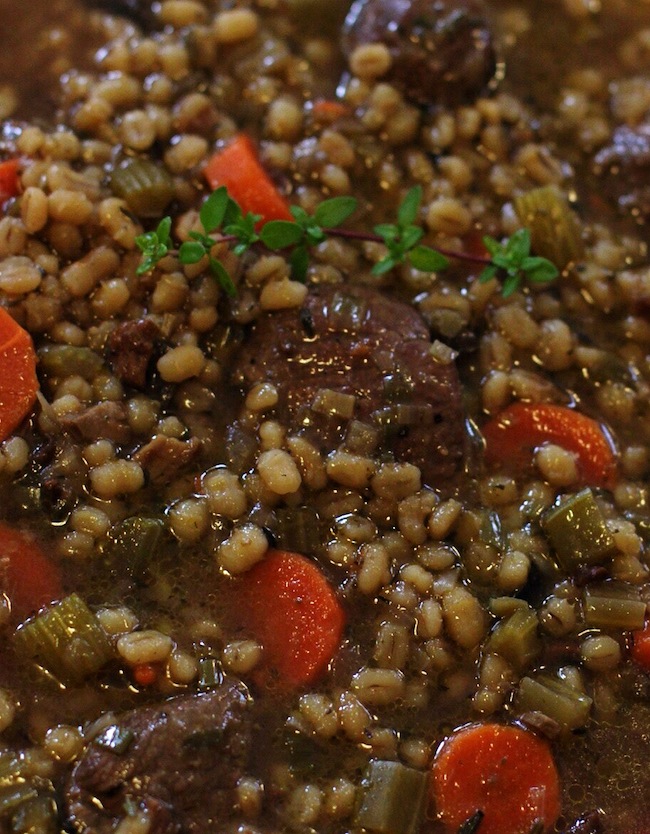 Start by pouring the boiling H2O over the mushrooms and allowing them to rehydrated in a small bowl. While they are plumping up and making mushroom broth, sauté the lamb chops and olive oil in a large heavy soup pot until they are browned on both sides. Add the carrots, onions, and celery and sauté a few more minutes. Pour in the chicken stock, sprinkle on the thyme, cover and simmer for half an hour. When the mushrooms are ready pull them out of their soaking water (which you will save) and chop. Carefully pour all but the last few teaspoons of mushroom soaking water into the soup pot (the last little bit will have a smidgen of dirt that clung to the mushrooms and trust me when I say you don’t want dirt in this soup) then add the chopped mushrooms. Throw in the barley, cover and simmer another thirty minutes. Give the soup a stir every so often, but if you don’t no worries – it will take care of itself. Add salt and pepper to taste before ladling out a few bowlfulls.