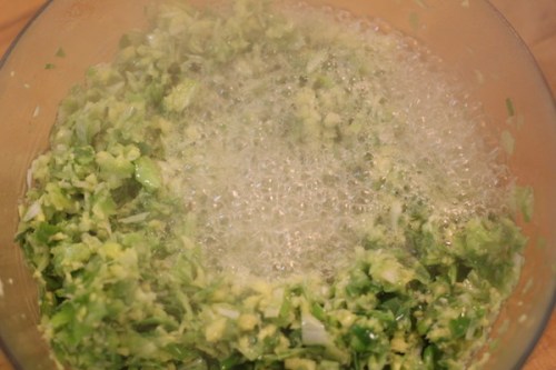Next cut off the roots of the scallions and peel away any dry bits. Cut into rough chunks and pulse the scallions in a food processor so they’re roughly the same size as the ginger. Try not to make scallion soup. Scrape the minced/chopped scallion in with the ginger and salt generously. To the point where you think you may have over-salted everything. Then heat the oil in a medium saucepan until smoking.