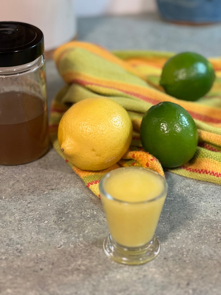 Put everything in a small pot and bring to a boil. Lower heat to a simmer and cook for 4-5 minutes, stirring once or twice. Cover, cool, then strain into a jar. You can push on the cooked ginger to squeeze out more flavor as you’re straining it.
