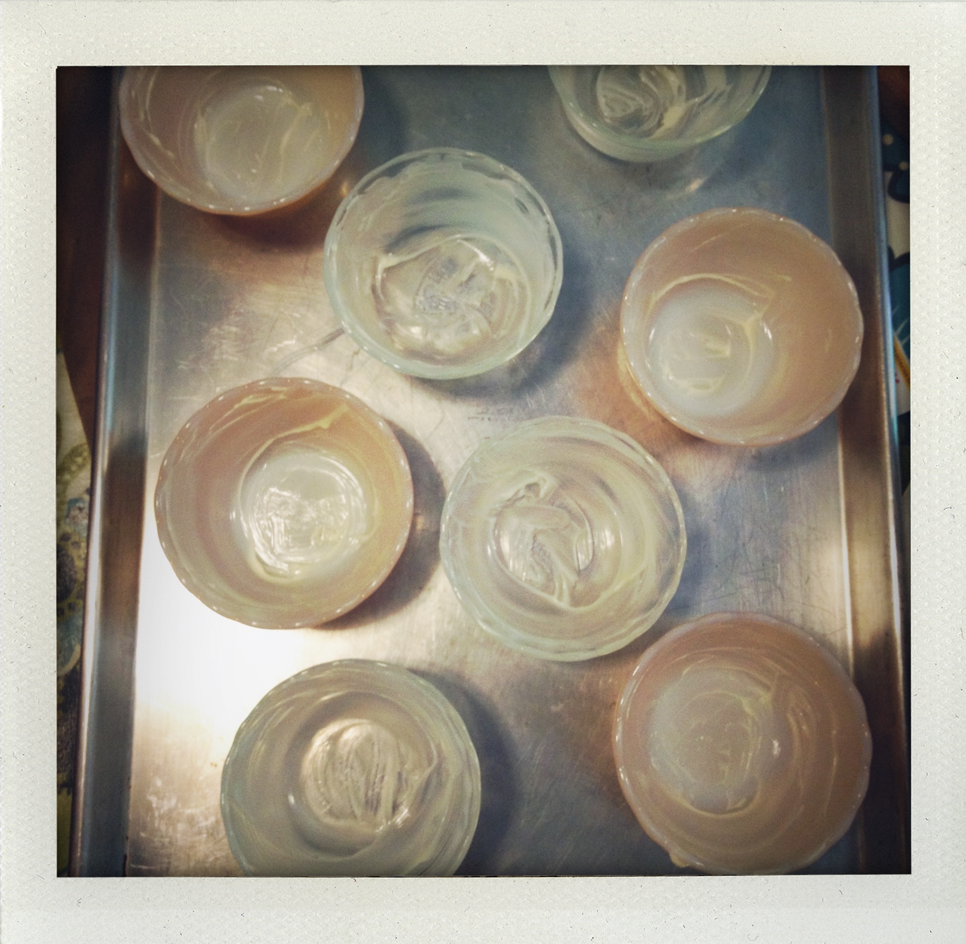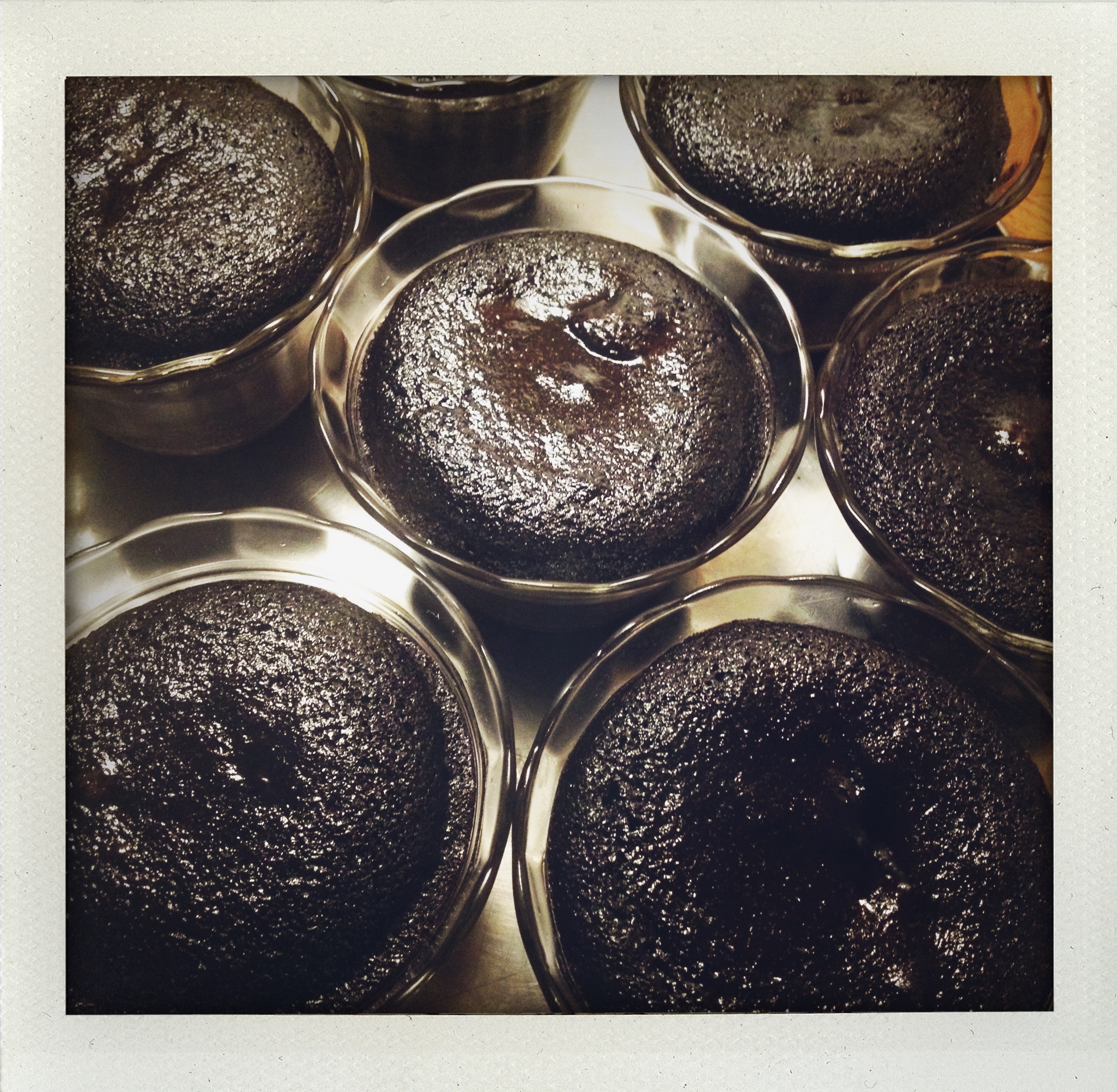 Preheat oven to 325ºF and grease 8 small custard cups with butter. Place on a jelly roll pan and set aside. In a medium saucepan heat espresso, kaluha, cocoa, and butter, whisking a bit. This mixture will smell heavenly but don’t be tempted to lick the whisk yet. Pour the hot liquid into a bowl and whisk in the sugar, stirring for about a minute. Add the flour, salt, baking soda and whisk some more. Plop in the egg and vanilla and when you’ve whisked everything is a velvety smoothness pour evenly into the prepared custard cups and slip into the oven for 6-9 minutes or until the edges of the cakes are just starting to set. At this moment you may lick the whisk. Pull the tray out, plunk a ganache ball into the center of each cake and return the tray to the oven for another 6-9 minutes. You don’t want to over cook these, but you want the cake batter to be cooked and the ganache melted and oozy in its chocolatey-ness. I suggest you look at the pictures below.