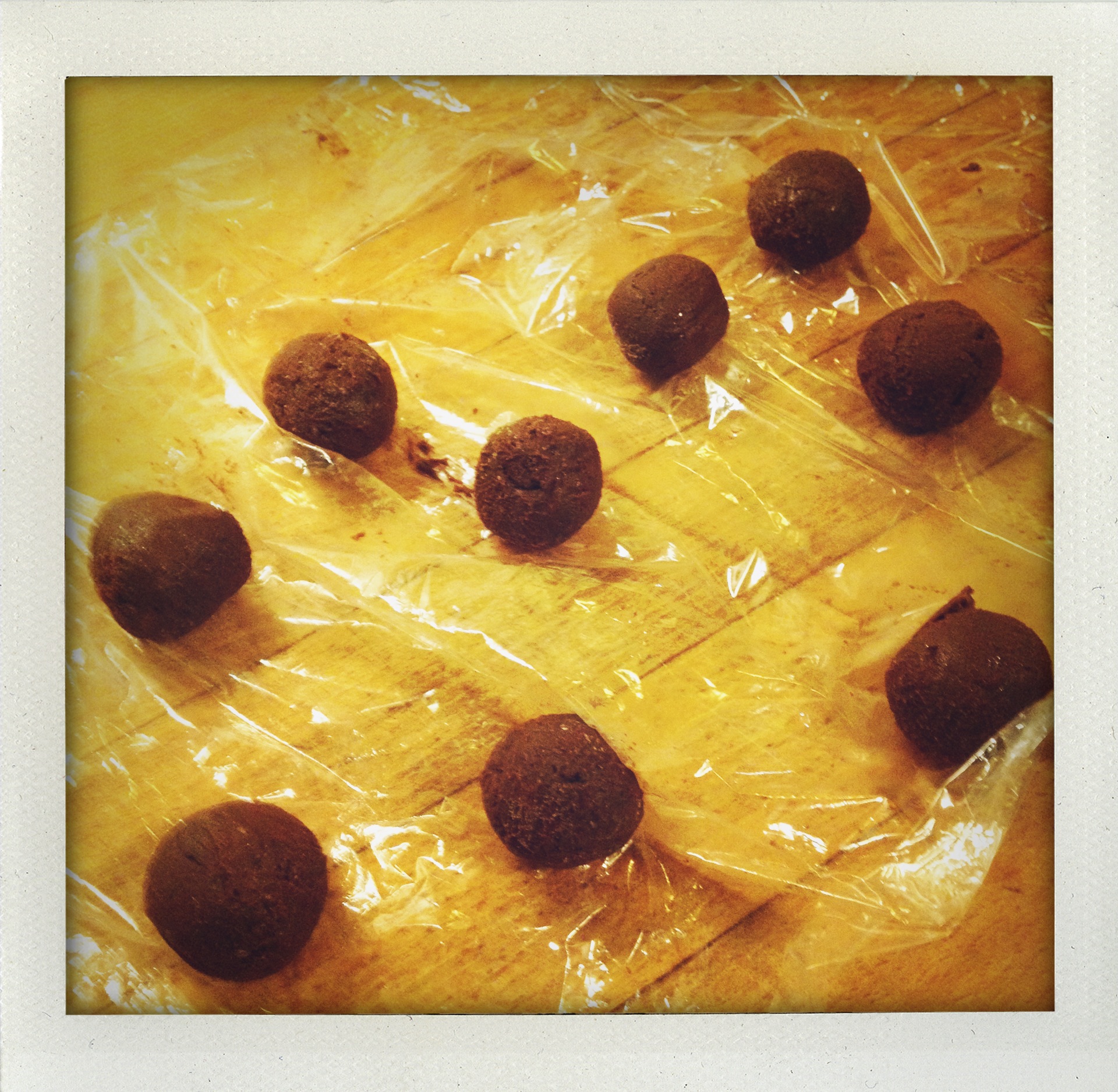 Basically you have two choices here. You can make an enormous quantity of chocolate ganache, let it firm up, then roll all of it into balls which you store in your freezer. Or you simply steal eight balls worth of ganache when you’re making truffles or glazing a cake.