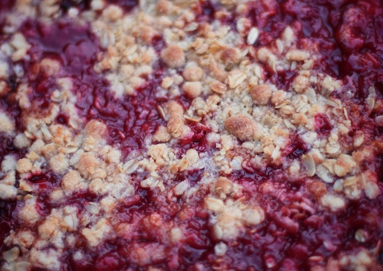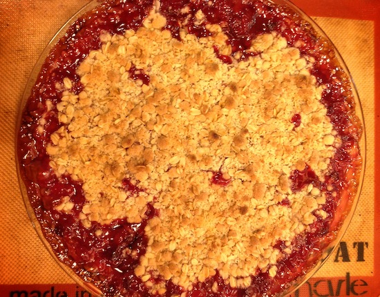 Pop in the oven for 45 minutes and then start to make your topping. Do this by rubbing the margarine (if you’re serving people who have dairy allergies or are vegan) into the flour/oatmeal/sugar mix with your fingertips until it is crumbly and had lumps the size of peas. If the cherry pie has been in the oven about 10 – 15 minutes carefully sprinkle the crumble over the top, making sure you do not dump too much in any one spot. If you like less crumble that this recipe makes simply sprinkle on what you like and freeze the rest for another pie or to put on top of muffins. Continue baking the pie until the topping is nicely browned and the sour cherry goo has bubbled up (hopefully not over too much) around the edges of your topping. When everything is brown and bubbly and smelling divine remove from the oven and cool.